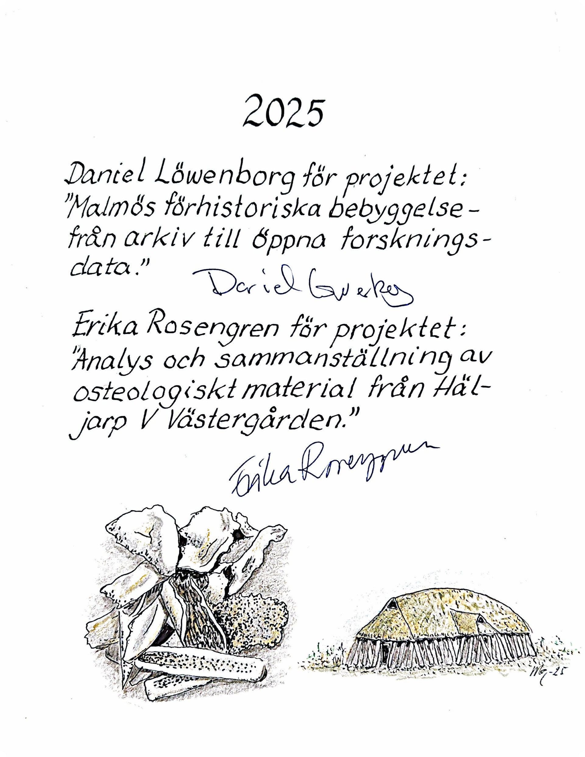 Fil.mag. Erika Rosengren, Lunds universitet, tilldelas 30 000 kr för projektet ”Analys och sammanställning av osteologiskt material från Häljarp V Västergården, Tofta socken, Skåne.”